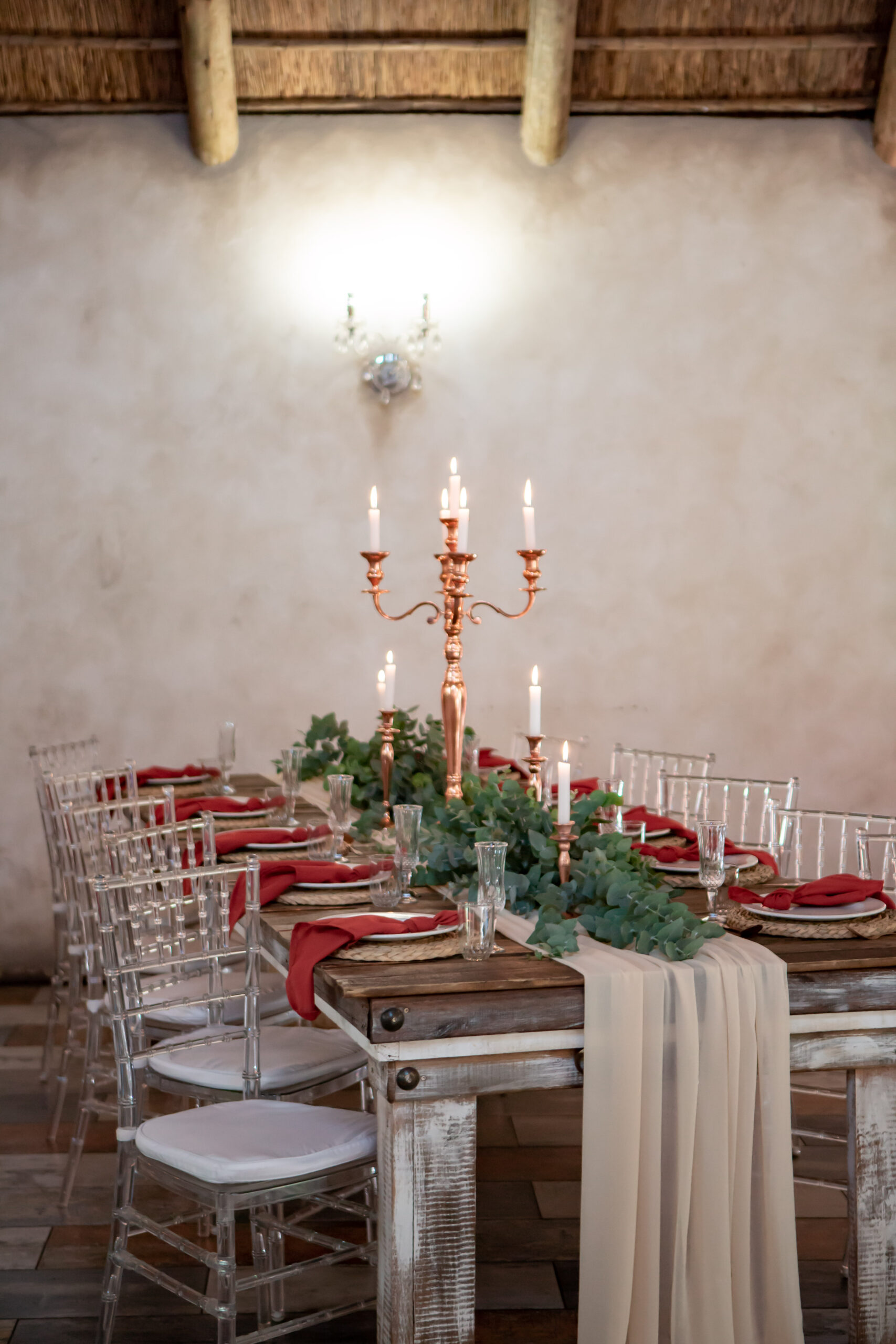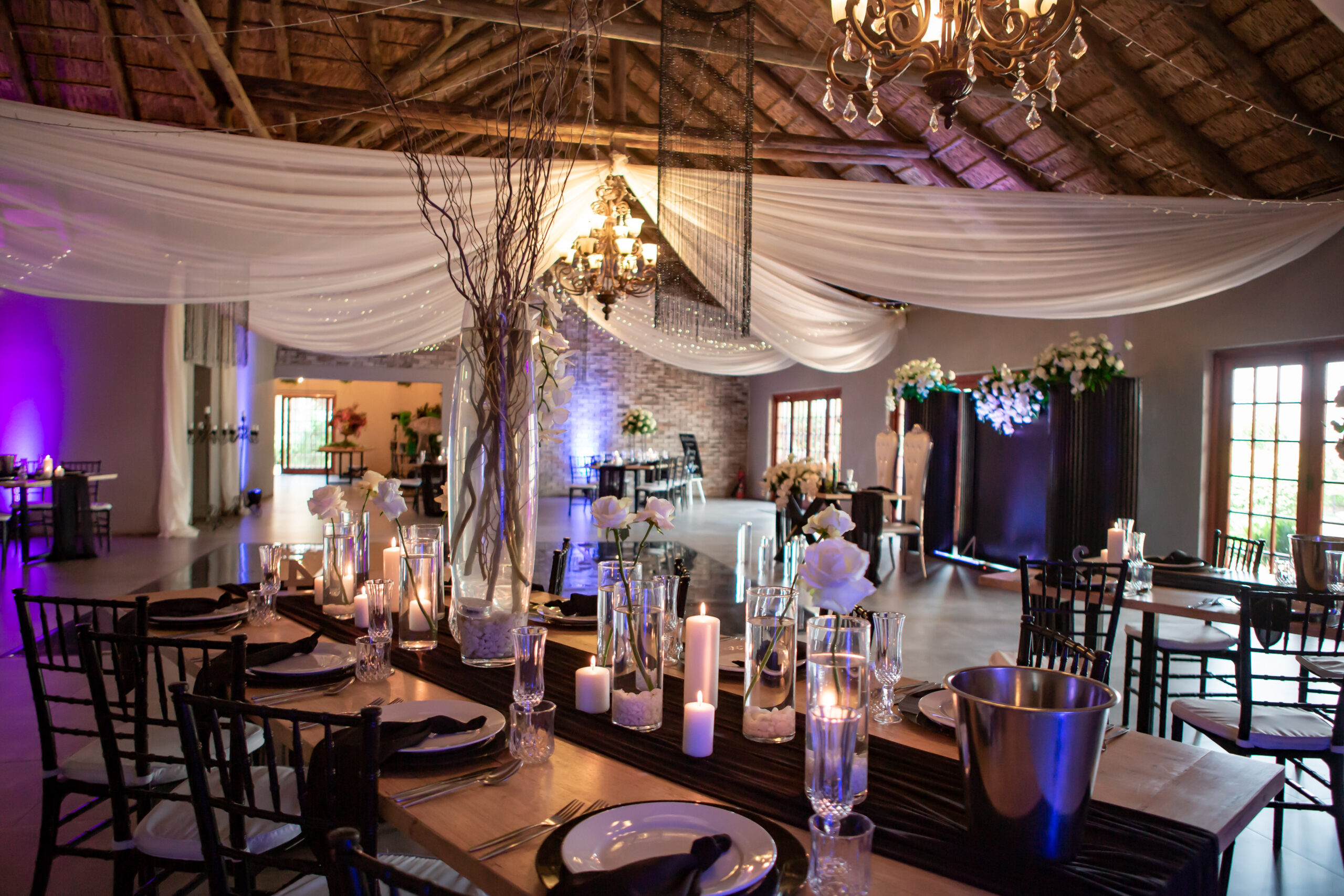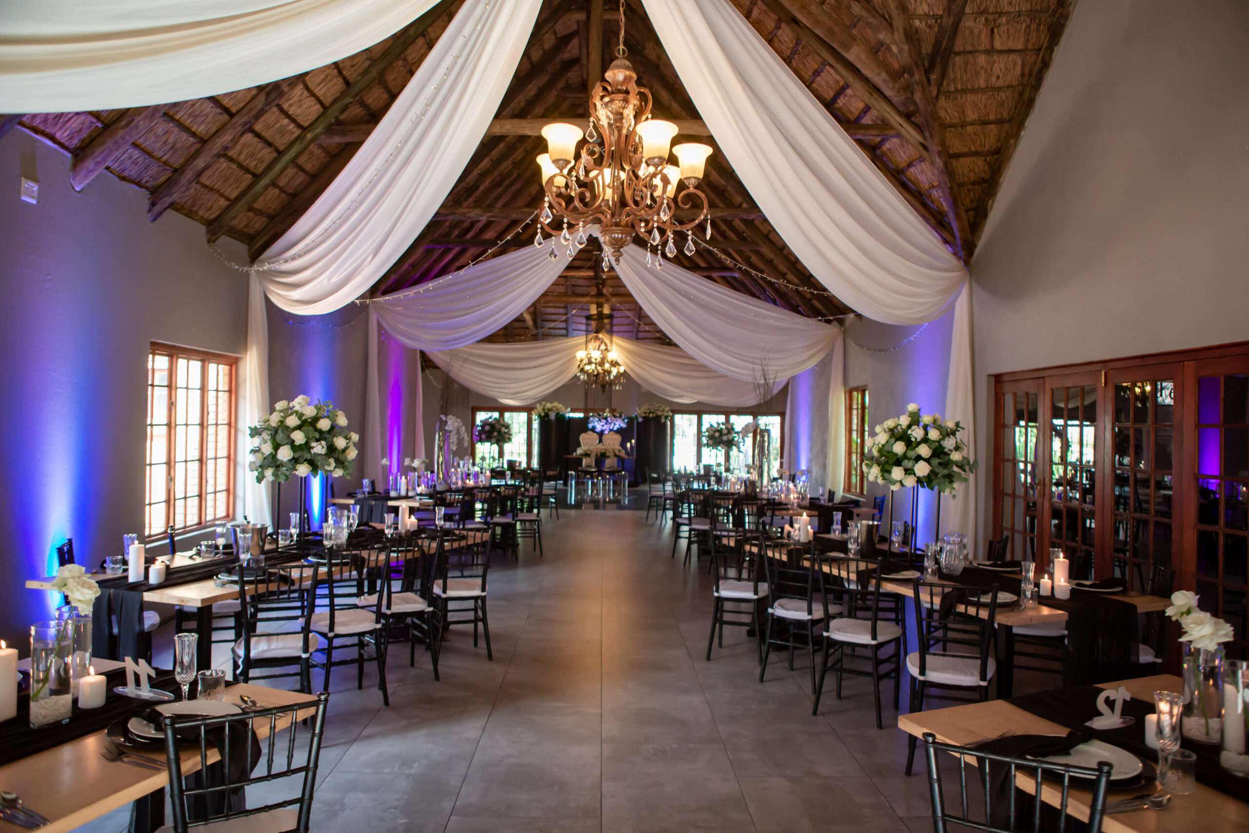 A beautifully refined rustic hall with classic chandeliers, a feature main-table area, dedicated buffet space, elegant bathrooms, and a private garden for photos or canapés.